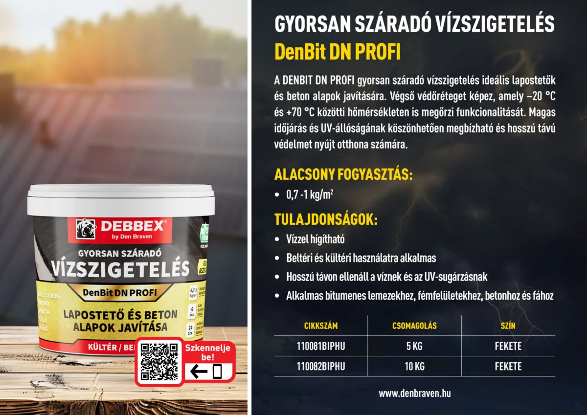 A DENBIT DN PROFI gyorsan száradó vízszigetelés ideális lapostetők és beton alapok javítására. Végső védőréteget képez, amely –20 °C és +70 °C közötti hőmérsékleten is megőrzi funkcionalitását. Magas időjárás és UV-állóságának köszönhetően megbízható és hosszú távú védelmet nyújt otthona számára.
